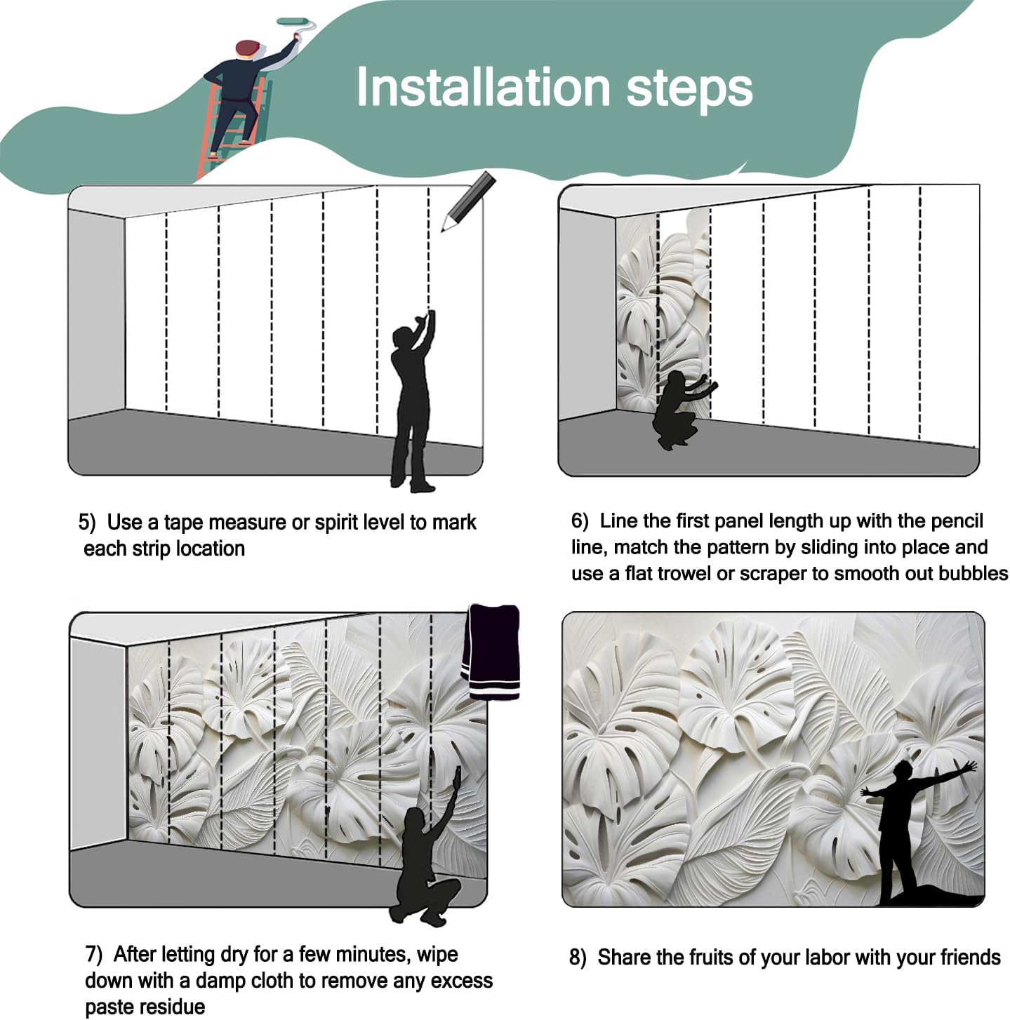 - Mural wallpaper size: 100 "W x 65 "H, divided into 5 sections, each section is labeled with a number underneath, there is no need to overlap the pattern when installing, just install according to the number labeled underneath the panel